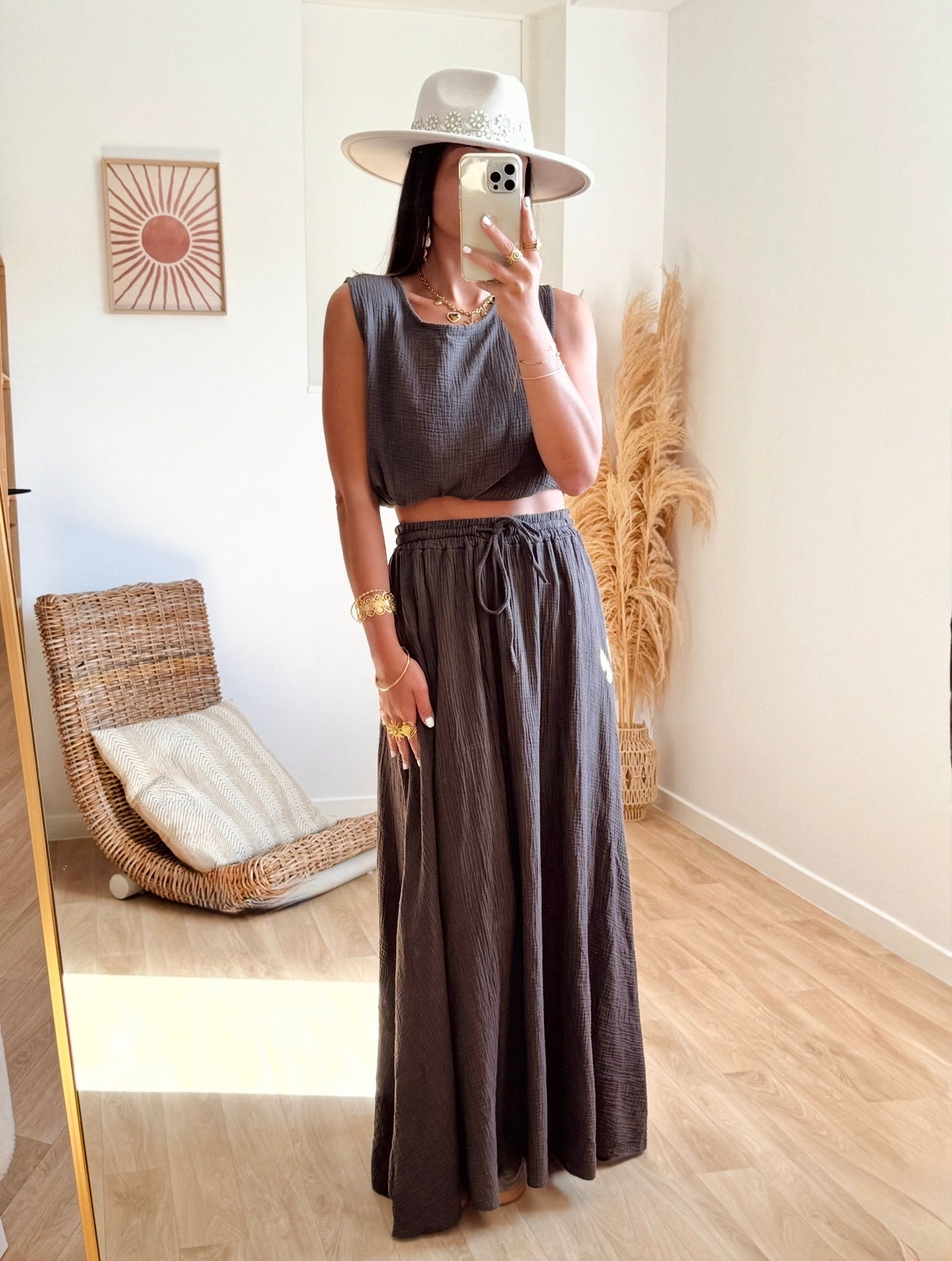 Ensemble en gaze de coton ultra doux & léger. Composé d’un top et d’une jupe fluide.