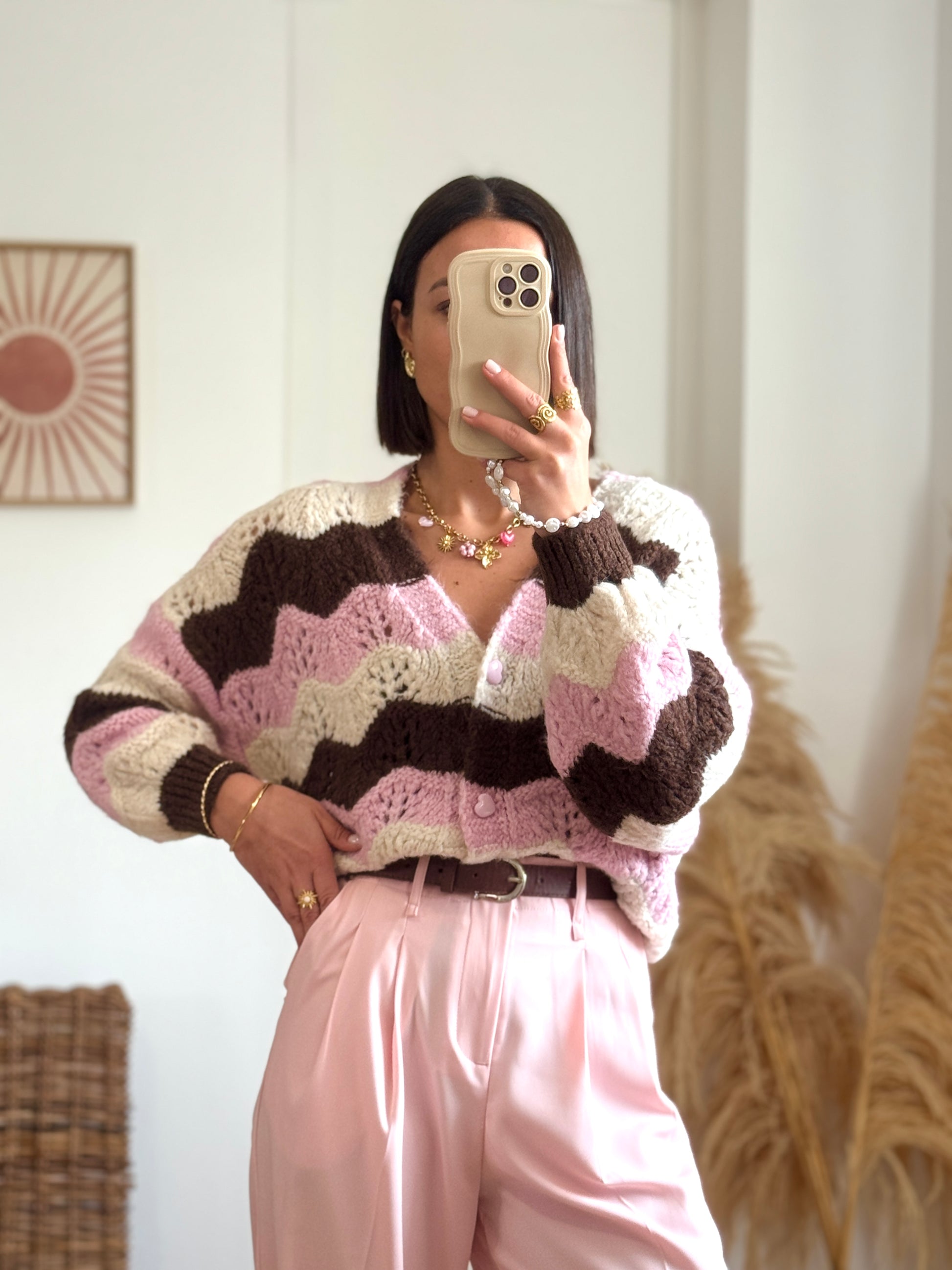 Confort absolu avec ce gilet tricolore aux tons chaleureux chocolat, écru et rose. Doux au toucher et hyper confortable, il deviendra ton allié idéal pour les journées cocooning comme pour compléter un look casual-chic. Son mélange de matières lui confère à la fois chaleur et souplesse, pour un porté agréable en toute saison.